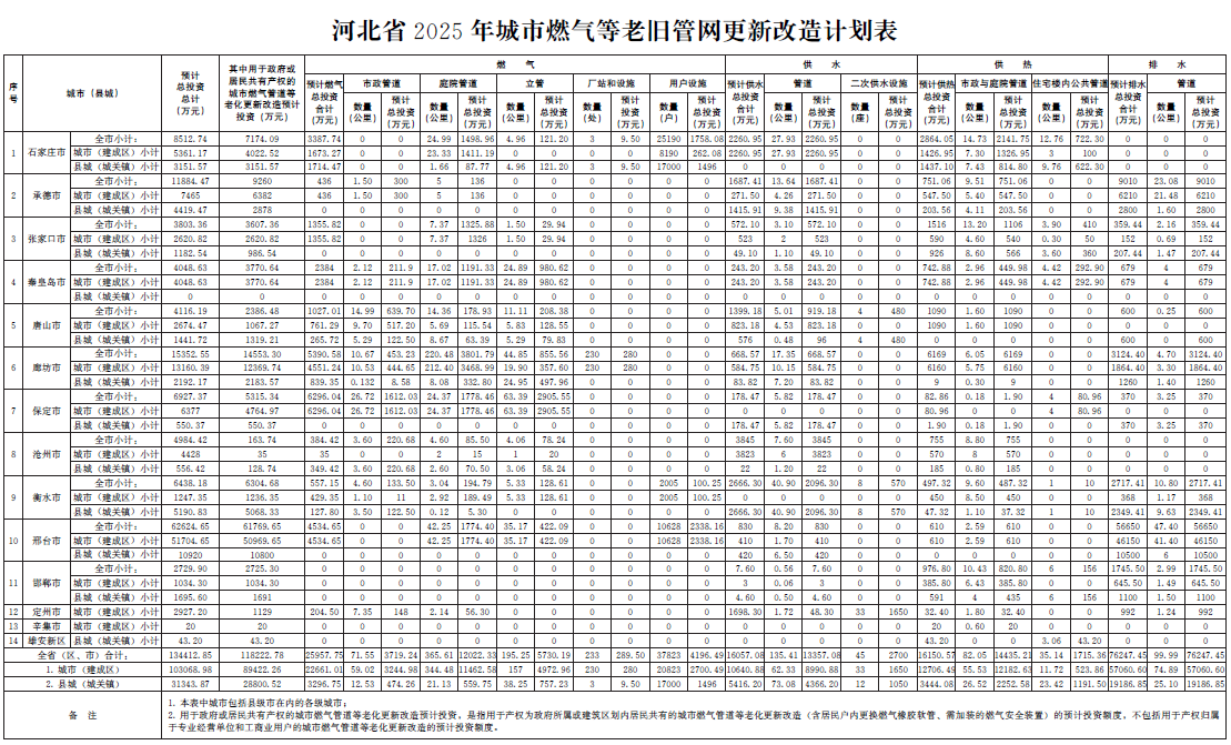 河北省2023-2025年城市燃气等老旧管网更新改造计划表